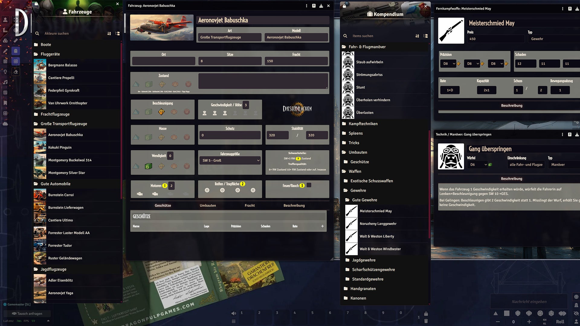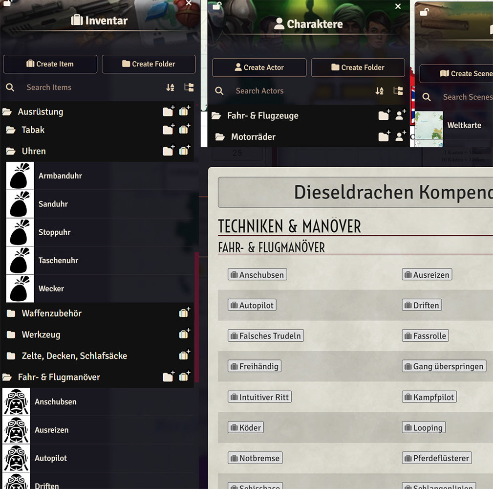 - Das DieseldrachenVTT-System (kostenlos!): https://foundryvtt.com/packages/dieseldrachen-vtt